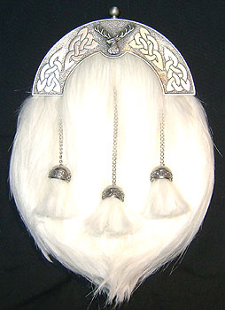 White dress sporran with stag cantle (Pewter top) The sporran is made with lorica and faux fur and is availble with either crossed or straight tassels.